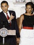 President Barack Obama, with his wife, the always lovely Michelle Obama, speaks during a reception for ambassadors in the Grand Foyer at The White House in Washington, Monday.