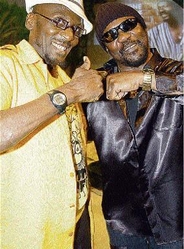 Two giants of the Jamaican music industry, Dr Jimmy Cliff (left) and 'Toots' Hibbert greet each other after the first taping of the series Breakfast with the Stars at the Wycliffe Bennett Studio at CPTC yesterday. Stars like Shaggy, Maxi Priest and Sean Paul are also in the line-up for future breakfasts that mark CPTC's 25th anniversary this year.