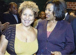 Angela Thame (left) is tickled by something Audrey Chin has told her. Both were at Breakfast with the Stars yesterday. - Photos by Peta-Gaye Clachar/Freelance Photographer