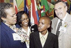 Governor Judith Reid (left), Optimist International representative, Vice-president Ron Lackey (right) and Lisa-Gaye Anderson in discussion with 13-year-old guest speaker Obrian Lewis after his speech at the Caribbean District Optimist International 18th annual district convention. - Rudolph Brown/Chief Photographer