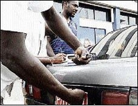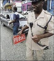 Deputy Superintendent Courtney Coubrie, operations officer at the Traffic headquarters, pulls over this taxi driver in Half-Way Tree. The police and members of the Transport Authority were busy in Half-Way Tree in St Andrew yesterday removing registration plates from taxis and buses with heavy tint and music equipment.