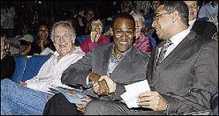 Dr Nigel Clarke (centre), Chairman, National Youth Orchestra of Jamaica (NYOJ), greets Minister of Education Andrew Holness while Chris Blackwell, patron, NYOJ, looks on. They were attending the launch of the NYOJ at the Courtleigh Auditorium last Friday evening. - photos by Colin Hamilton/Freelance Photographer