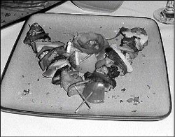 Left: Yummy! Eaton Owen's pork kabob, served in orange and pineapple jerk sauce, is mouth-wateringly good. Right: Eaton Owen's jerked lamb chop served in a jerk salsa sauce.