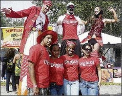 The Fort Lauderdale Digicel crew (front row, from left), Jordon Mason, Cammel Mair-Rowe, Natalie Vertus and Elsa Espana hang out with their stilt-walkers (back row, from left), Rudi Goben, Ty Barker and Espy Rodriguez.