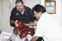 Nigel Warmington (left) helps Supreme Ventures' Paul Hoo to unwrap his birthday gift at an impromptu 50th birthday celebration held in the latter's honour on Wednesday. - Contributed