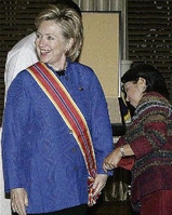 United States Secretary of State Hillary Rodham Clinton (left) smiles as Philippine President Gloria Macapagal Arroyo arranges her sash during the conferment of the Sikatuna award with the rank of Datu, a title bestowed on tribal chiefs and monarchs in the Philippines, at the Bahay Pangarap, Malacanang Park, in Manila, Philippines, yesterday. The award is conferred by the Philippine government upon diplomats, officials and nationals of foreign states who have rendered services in fostering, developing and strengthening relations between their country and the Philippines.