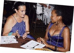 Stephanie Scott (left) speaks with Cherine Anderson during the final night of Restaurant Week that saw young musicians and artistes at the Market Place along Constant Spring Road, dining out at the Café Aubergine. - Colin Hamilton/Freelance Photographer