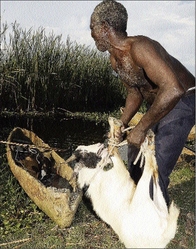 Anyway, it was while standing on a lonely stretch of road in Slipe that I heard a noise in the swamp about 100 feet away. I thought at first that it might have been a crocodile, so my immediate inclination was, of course, to head for the hills. But soon a man's head came into view. He seemed to have been merrily paddling a small canoe to shore. I decided to walk over to meet him. I got there just as he was gathering a frayed rope to tie the canoe to a rock.