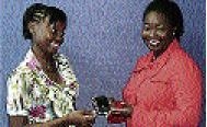 Kristina Cassell (left) receives her new BlackBerry Bold, courtesy of Digicel from Kerry-Ann S. Robinson, corporate relations executive with Digicel Business.