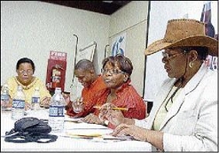 Left: Top-three winners of the Red Label Wine Christmas Cake competition with their gift baskets, courtesy of J. Wray & Nephew Limited. They are (from left): Stephanny Richards (third place), Kevin Stewart (winner) and Lorna Wilson (second place). Right: Judges from left: Valrie Davis, two-time winner of the contest; Romario Samuels and Marilyn Bennett, representing the sponsors, and Lorraine Clunie of Elegant Weddings.