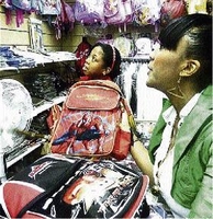 Female dancehall deejay Tifa (right) examines two bags while shopping at Matar Hanna during the 'Christmas In The City: Downtown Comes Alive' promotion on Wednesday. Tifa was at the store purchasing gifts for orphans at the Missionaries of the Poor's Bethlehem Home located in downtown Kingston. - photo by Marlon Vickerman