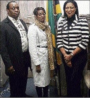 Freddie Gayle of Maestro Music and June Daley (right) president of Miss Jamaica UK, pose for the camera during a courtesy call on Jamaica's deputy high commissioner to the United Kingdom, Joan Thomas Edwards, at the commission in London on Friday, January 29. They discussed fund-raising plans for earthquake-ravaged Haiti. Gayle is promoting a concert featuring Beres Hammond, Gregory Isaacs and the Heptones in May and part-proceeds will go to Haiti.