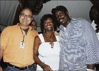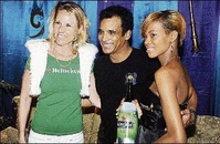Cuban-American singer Jon Secada is sandwiched by Frederique Asberg (left), country manager, Heineken, and Pamela Francis, at the Jamaica Jazz and Blues festival in Trelawny on Saturday night.