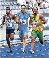 Jamaica's Michael Frater (right) runs against Italy's Smone Collio (centre) and Jack Iroga of the Solomon Islands, in the men's 100m first-round heat during the World Athletics Championships in Berlin yesterday. - Photo by Oliver Wright